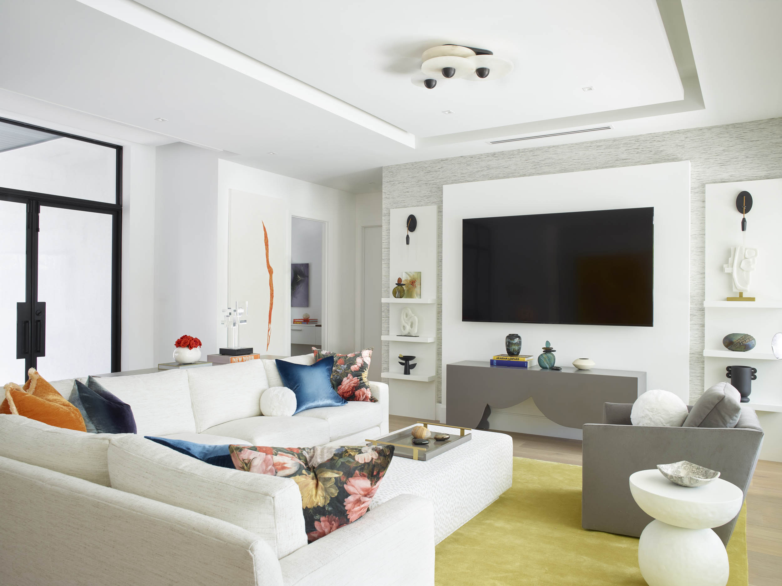 An art collecting couple welcome color into their home. While the hues are dialed back to keep the tone of the home calm and neutral, color is popped into spaces in more subdued ways via pillows, lighting, a furniture piece or town, and various accessories.
